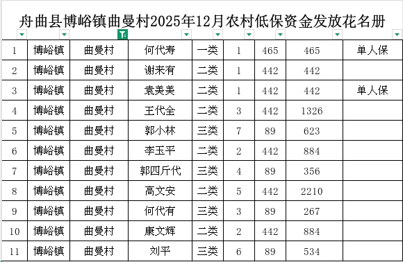 舟曲县博峪镇曲曼村2025年12月农村低保资金发放花名册