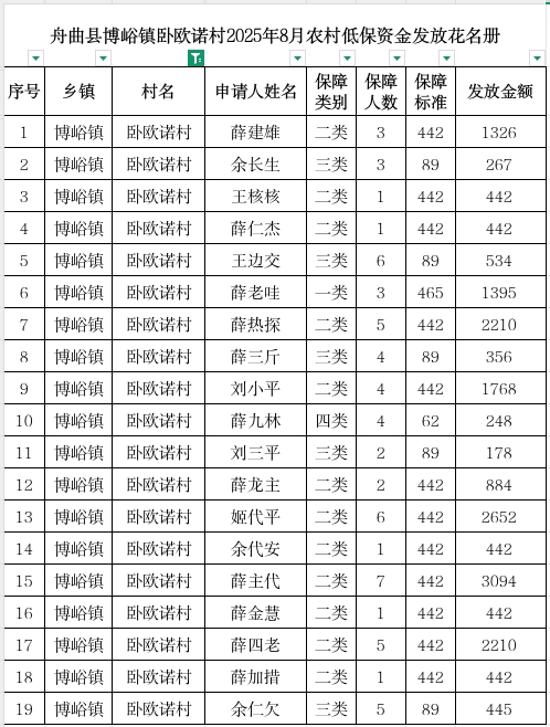 博峪镇卧欧诺村2025年8月农村低保发放花名册