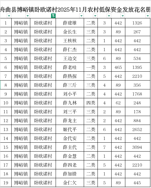 舟曲县博峪镇卧欧诺村2025年11月农村低保资金发放花名册