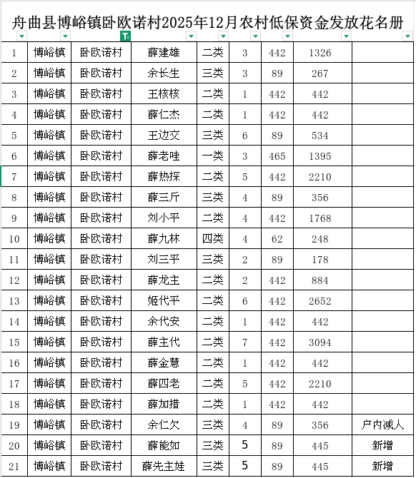 舟曲县博峪镇卧欧诺村2025年12月农村低保资金发放花名册