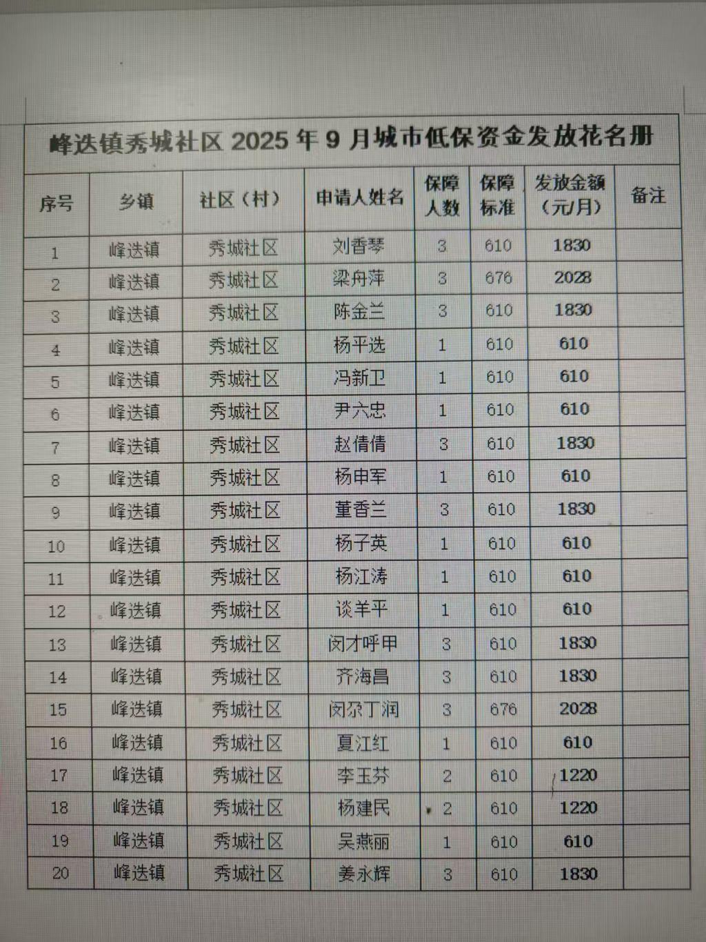 峰迭镇秀城社区2025年9月份城市低保资金发放花名册