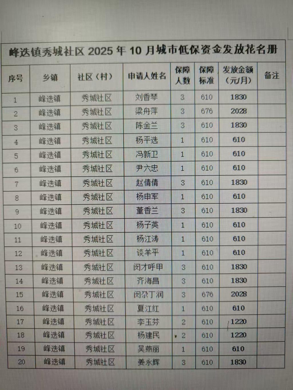 峰迭镇秀城社区2025年10月份城市低保资金发放花名册