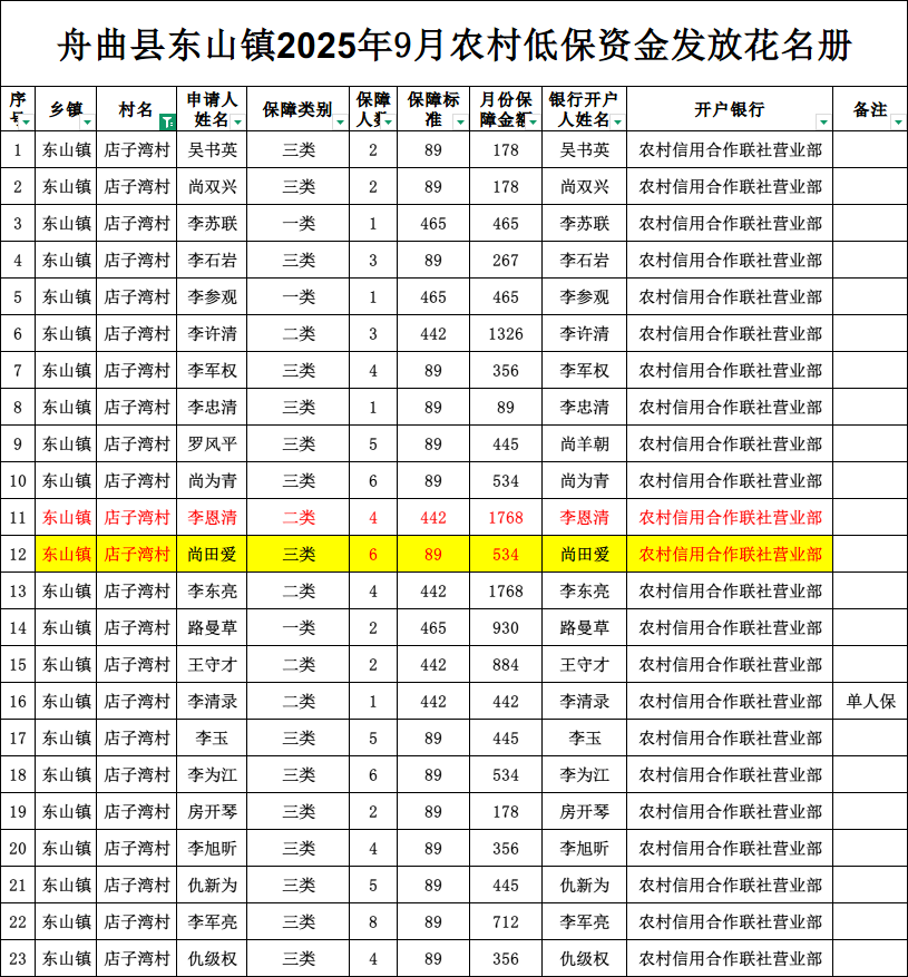 现将舟曲县东山镇店子湾村2025年9月农村低保资金发放花名册(详见附件)。