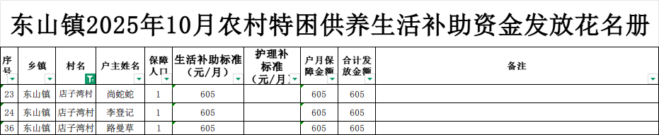 现将东山镇店子湾村2025年10月农村特困供养生活补助资金发放花名册公示如下(详见附件)。