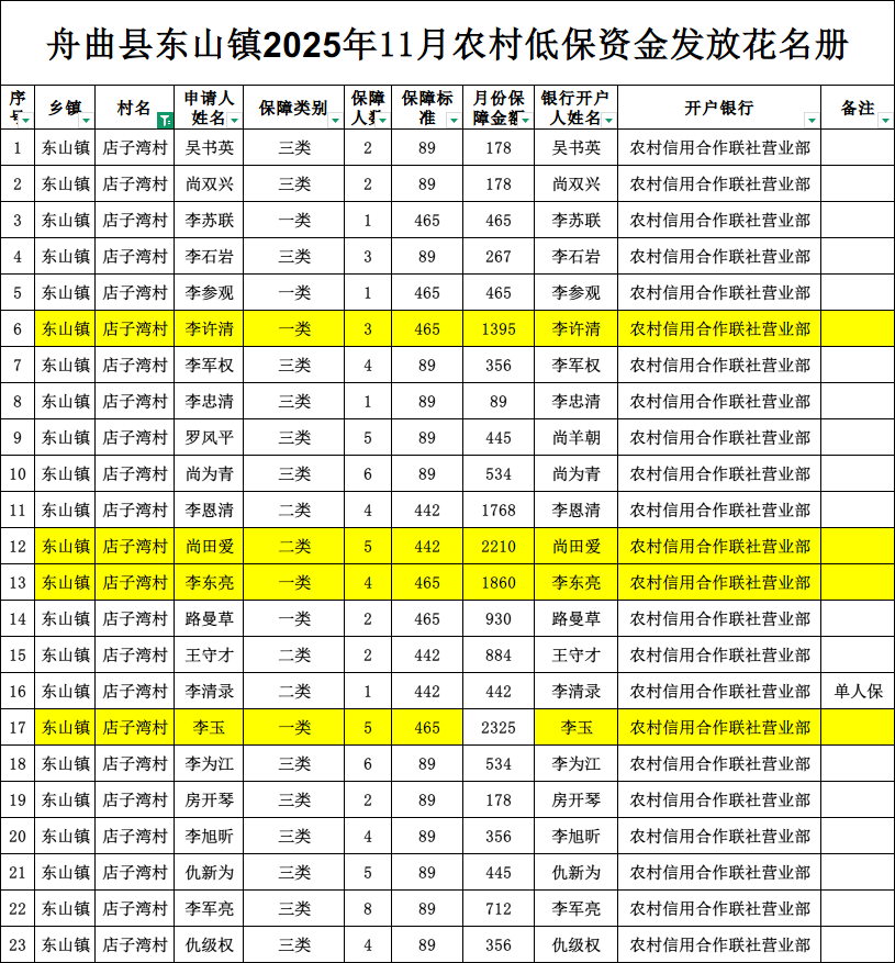 现将东山镇店子湾村2025年11月农村低保资金发放花名册公示如下(详见附件)。