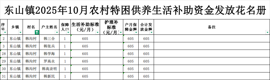 现将东山镇韩沟村2025年10月农村特困供养生活补助资金发放花名册公示如下(详见附件)。