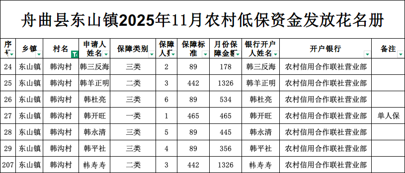 现将东山镇韩沟村2025年11月农村低保资金发放花名册公示如下(详见附件)。