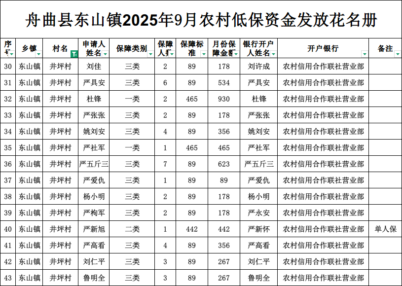 舟曲县东山镇井坪村2025年9月农村低保资金发放花名册
