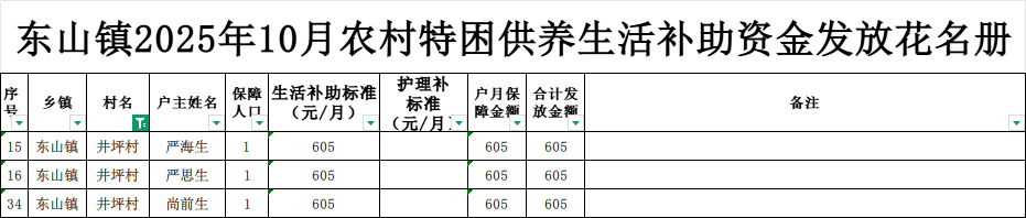 现将东山镇井坪村2025年10月农村特困供养生活补助资金发放花名册公示如下(详见附件)。