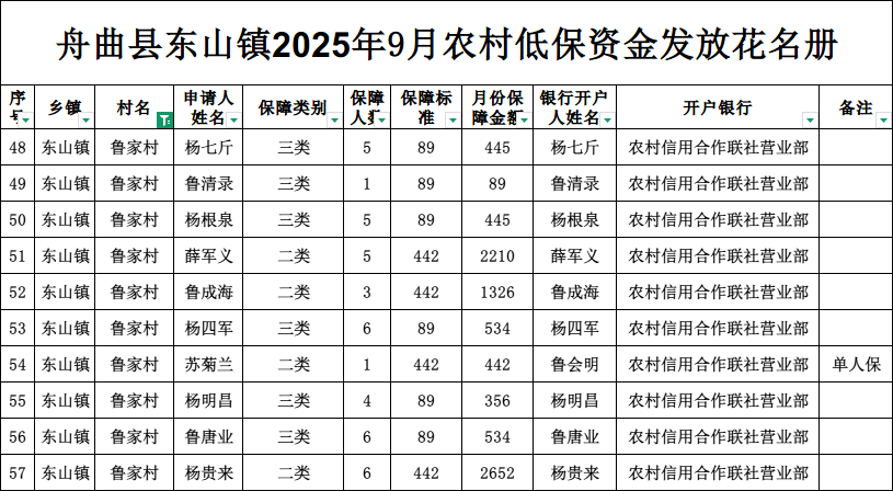 现将舟曲县东山镇鲁家村2025年9月农村低保资金发放花名册公示如下(详见附件)。