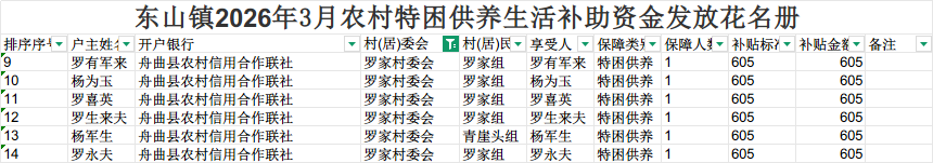 现将东山镇罗家村2026年3月农村特困供养生活补助资金发放花名册(详见附件)。