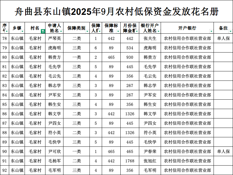 现将舟曲县东山镇毛家村2025年9月农村低保资金发放花名册公示如下(详见附件)。