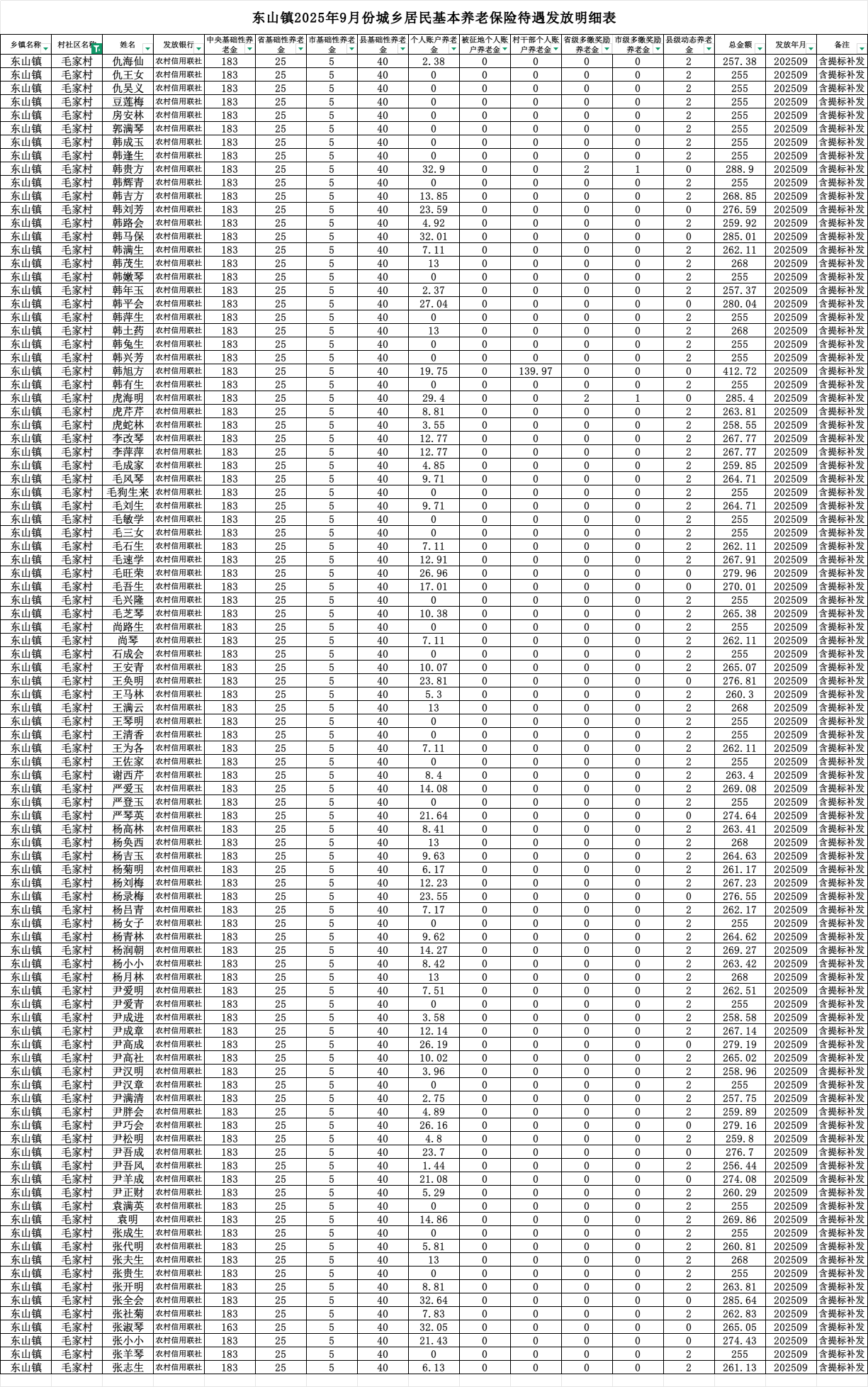 现将东山镇毛家村2025年9月份城乡居民基本养老保险待遇发放明细表公示如下(详见附件)。