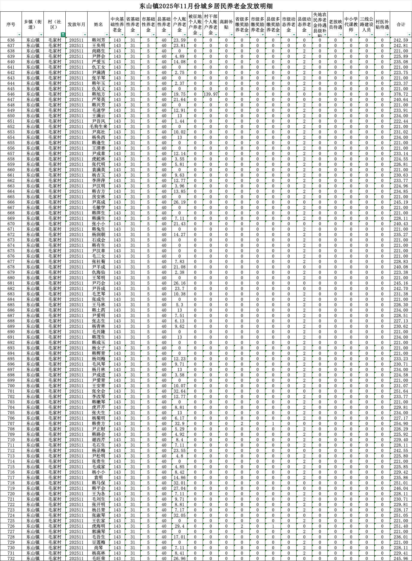 现将东山镇毛家村2025年11月份城乡居民养老金发放明细花名册公示如下(详见附件)。