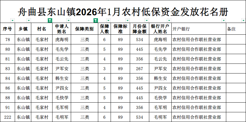 现将舟曲县东山镇毛家村2026年1月农村低保资金发放花名册公示如下(详见附件)。