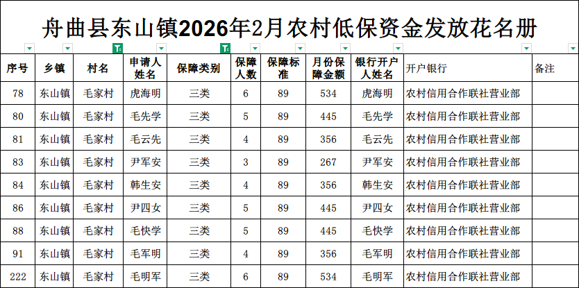 现将舟曲县东山镇毛家村2026年2月农村低保资金发放花名册公示如下(详见附件)。