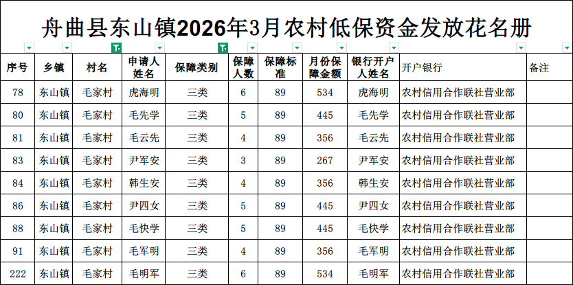 现将舟曲县东山镇毛家村2026年3月农村低保资金发放花名册公示如下(详见附件)。