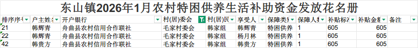 现将东山镇毛家村2026年1月农村特困供养生活补助资金发放花名册(详见附件)。