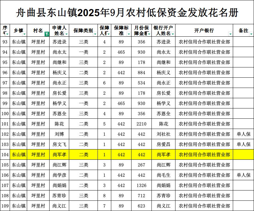 现将舟曲县东山镇坪里村2025年9月农村低保资金发放花名册公示如下(详见附件)。