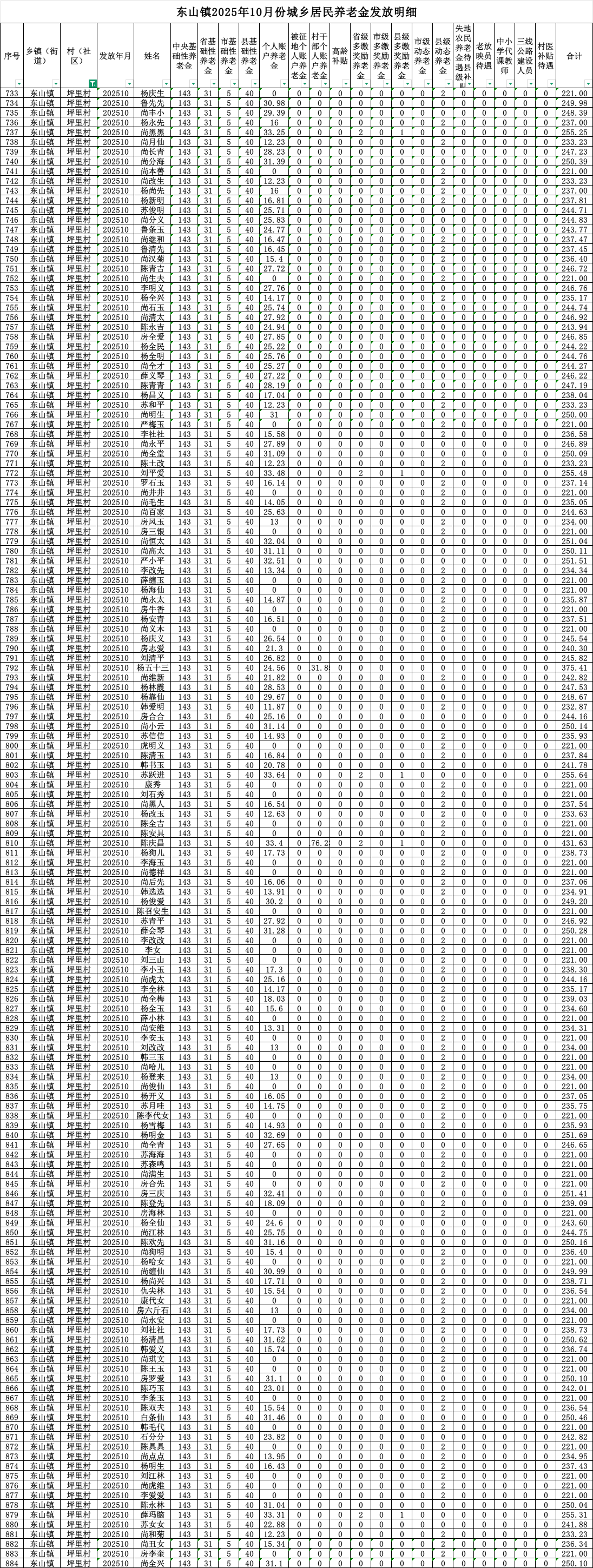 现将东山镇坪里村2025年10月份城乡居民养老金发放明细公示如下(详见附件)。