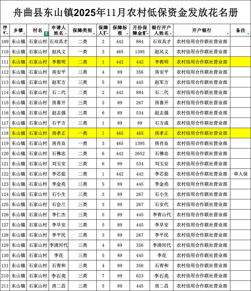现将东山镇石家山村2025年11月农村低保资金发放花名册公示如下(详见附件)。