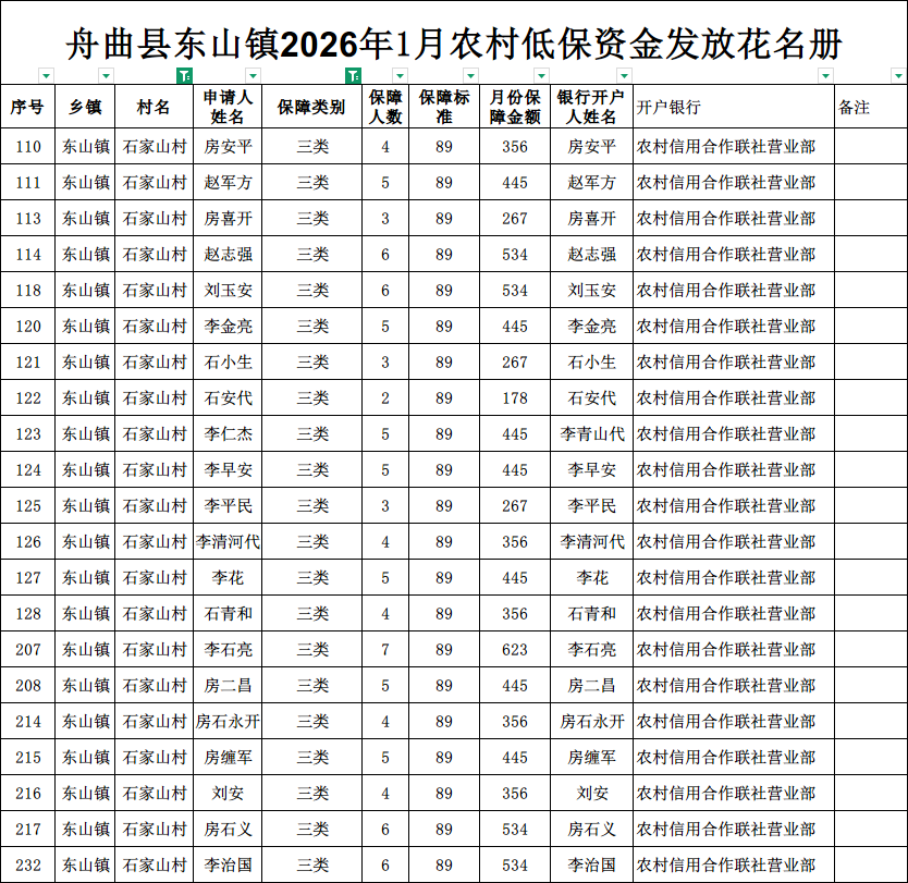 现将舟曲县东山镇石家山村2026年1月农村低保资金发放花名册公示如下(详见附件)。