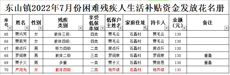 东山镇石磊村2022年7月份困难残疾人生活补贴资金发放花名册