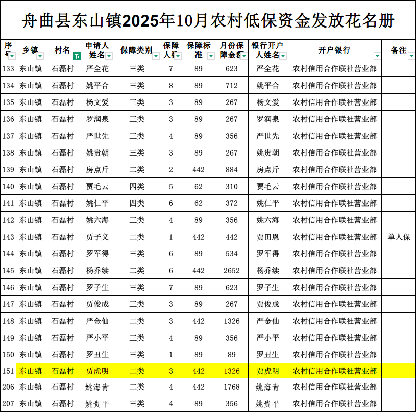 现将东山镇石磊村2025年10月农村低保资金发放花名册公示如下(详见附件)。