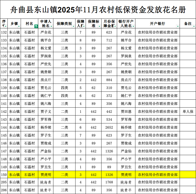 现将东山镇石磊村2025年11月农村低保资金发放花名册公示如下(详见附件)。