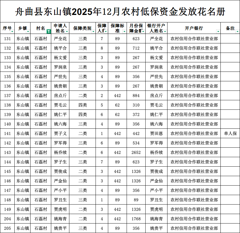 现将舟曲县东山镇石磊村2025年12月农村低保资金发放花名册公示如下(详见附件)。