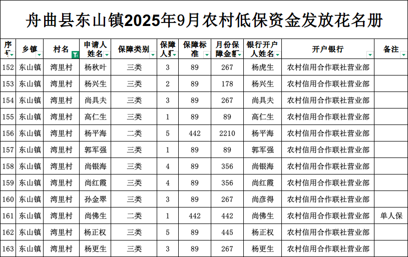 现将舟曲县东山镇湾里村2025年9月农村低保资金发放花名册公示如下(详见附件)。