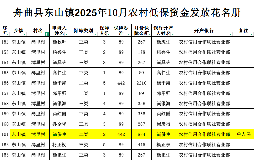 东山镇湾里村2025年10月农村低保资金发放花名册