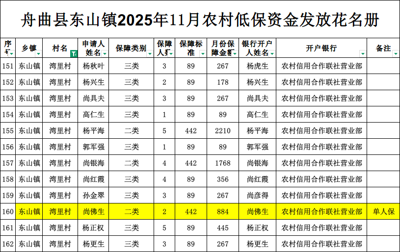 现将东山镇湾里村2025年11月农村低保资金发放花名册公示如下(详见附件)。