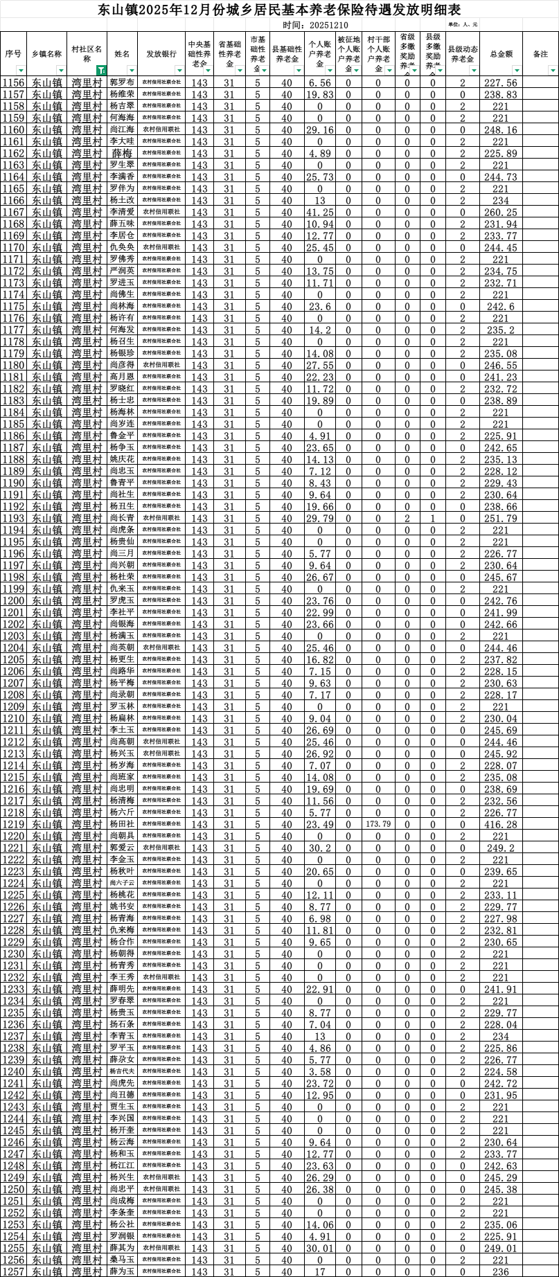 东山镇湾里村12月份城乡居民基本养老保险待遇发放明细表