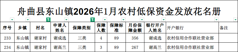 现将舟曲县东山镇谢家村2026年1月农村低保资金发放花名册公示如下(详见附件)。