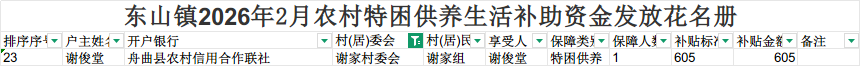 现将东山镇谢家村2026年2月农村特困供养生活补助资金发放花名册(详见附件)。