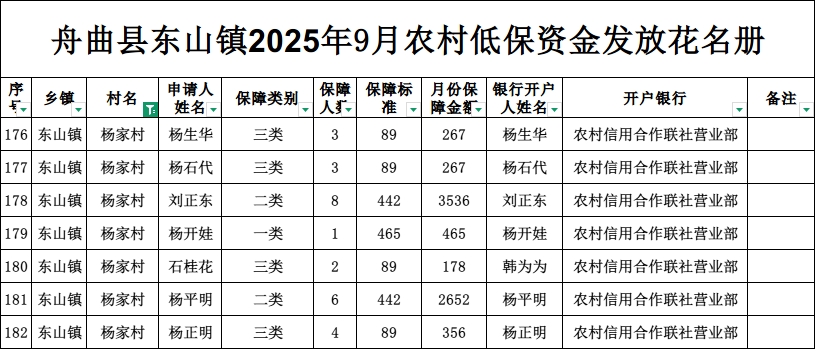 舟曲县东山镇杨家村2025年9月农村低保资金发放花名册