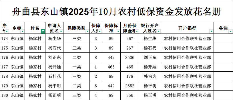现将东山镇杨家村2025年10月农村低保资金发放花名册公示如下(详见附件)。