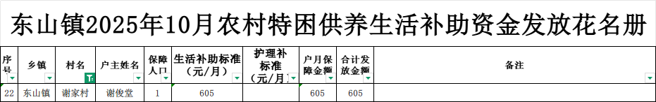现将东山镇杨家村2025年10月农村特困供养生活补助资金发放花名册公示如下(详见附件)。
