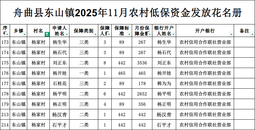 现将东山镇杨家村2025年11月农村低保资金发放花名册公示如下(详见附件)。