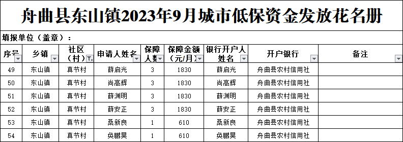 舟曲县东山镇真节村2023年9月城市低保资金发放花名册