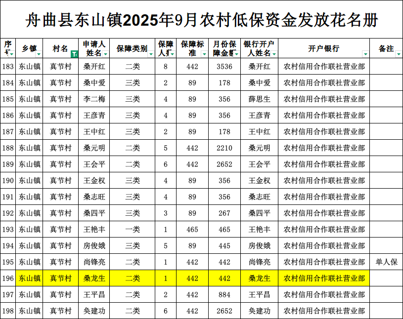 舟曲县东山镇真节村2025年9月农村低保资金发放花名册
