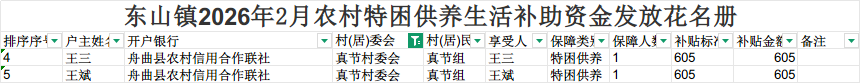现将东山镇真节村2026年2月农村特困供养生活补助资金发放花名册(详见附件)。