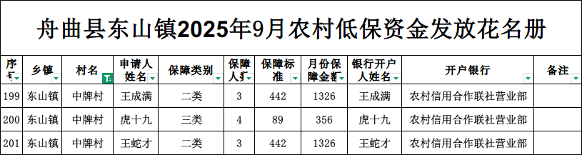 现将舟曲县东山镇中牌村2025年9月农村低保资金发放花名册公示如下(详见附件)。