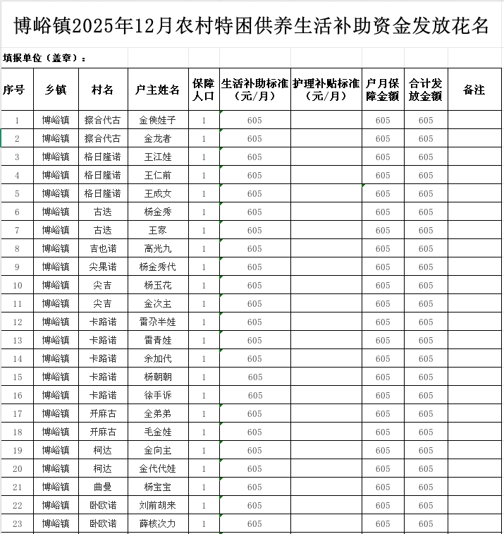博峪镇2025年12月农村特困人员救助供养一次性生活补助