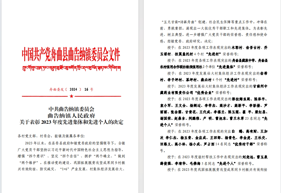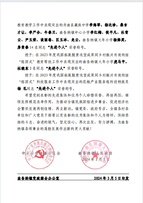 中共曲告纳镇委员会 曲告纳镇人民政府关于表彰 2023 年度先进集体和先进个人的决定