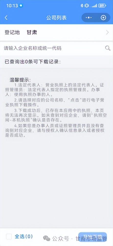 2、通过实名认证后,选择企业所在的登记地,显示该登记地的所有可下载和已下载的执照记录,在“可下载执照记录”中选择企业名称,下载该企业的电子营业执照。