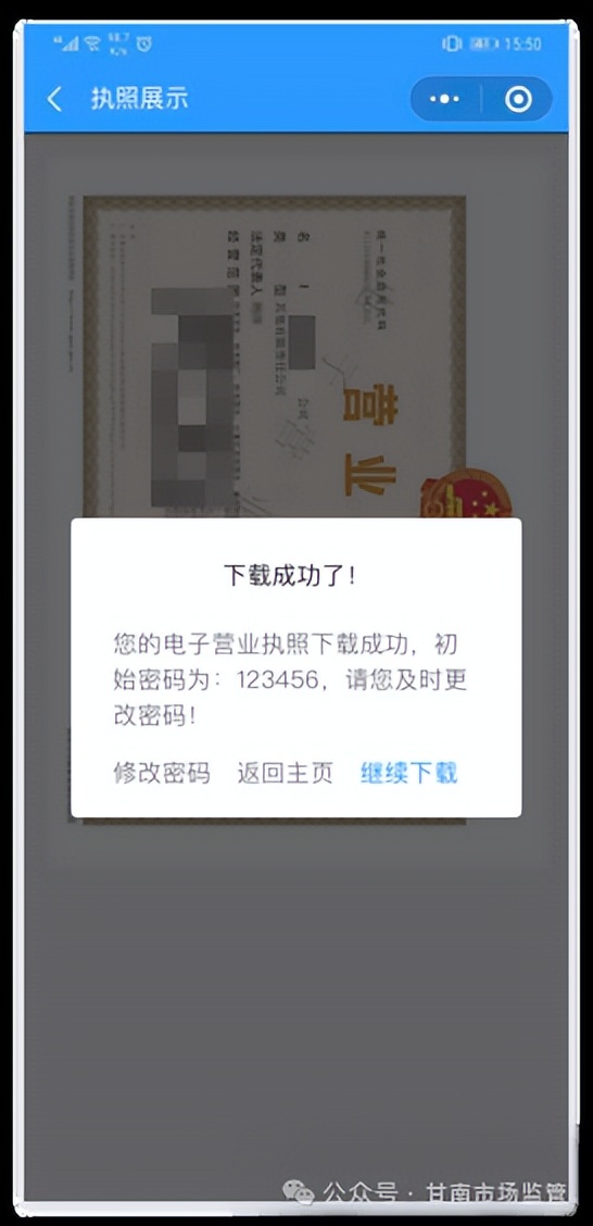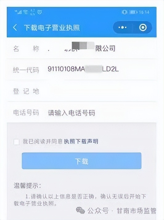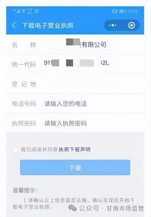 3.下载电子营业执照前,需要阅读并同意《执照下载声明》。如果在APP上修改过密码,下载时需要输入修改后的密码。