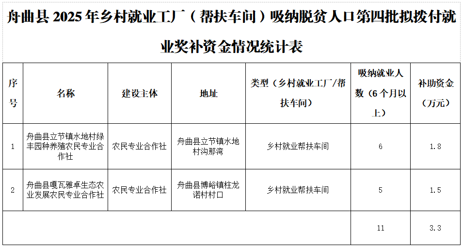 关于舟曲县2025年乡村就业工厂(帮扶车间)吸纳脱贫人口拟拨付第四批就业奖补资金的公示