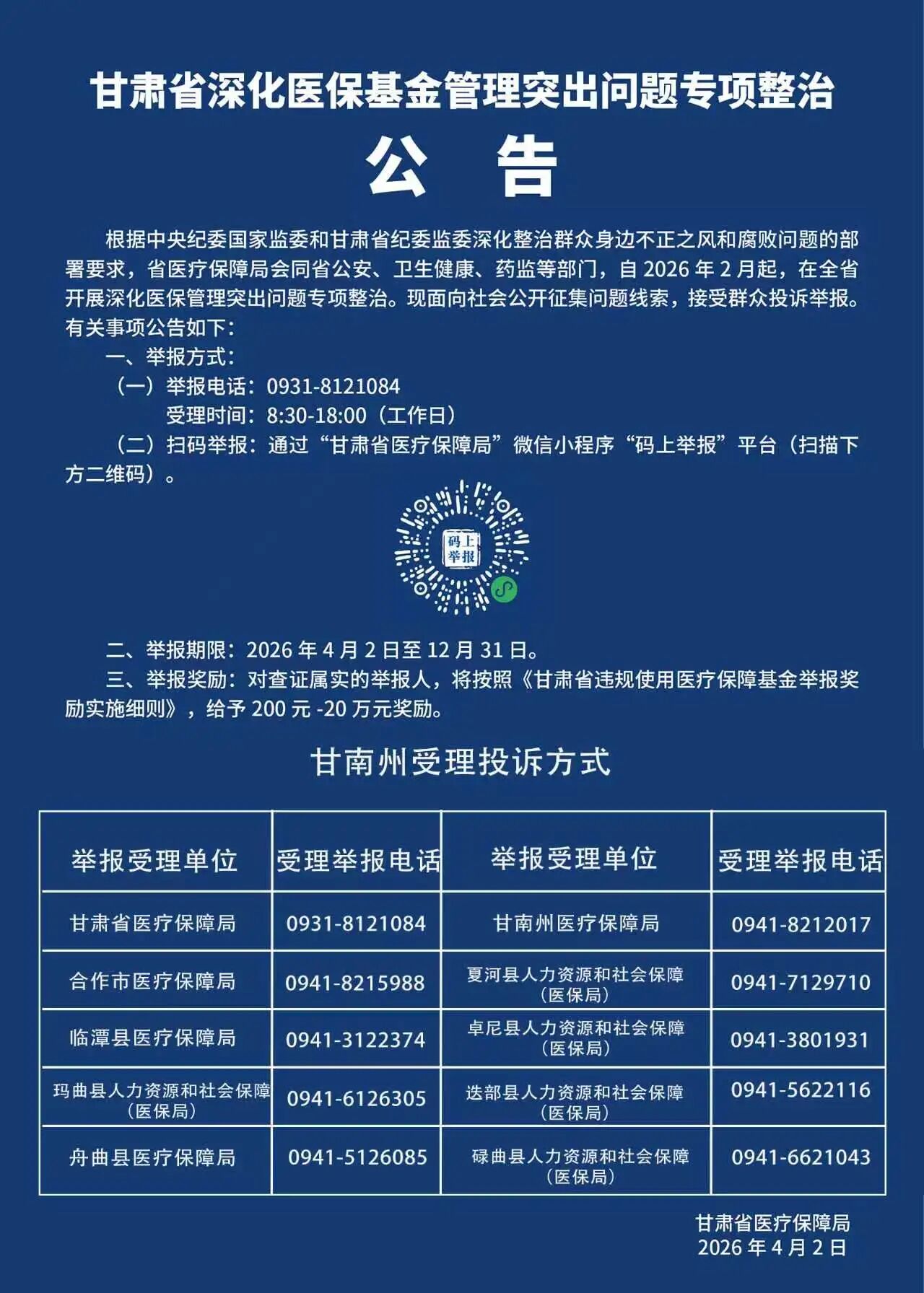 【医保基金监管宣传月(十九)】甘肃省深化医保基金管理突出问题专项整治公告